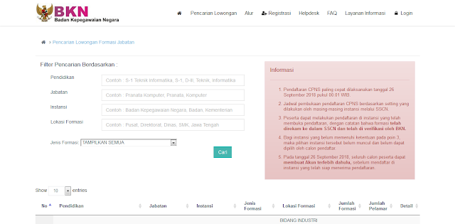 Sesuai dengan judul banyak yang mungkin penasaran dengan formasi CPNS di sscn.bkn.go.id karna pemerintah masih membukan proses pendaftaran sampai saat ini ya walaupaun tanggal 5-10.2018 kemarin sempai tidak bisa dibuka dihampir semua tempa diakibatkan kuota server, sistem, jaringan, atau bisa juga sengaja.