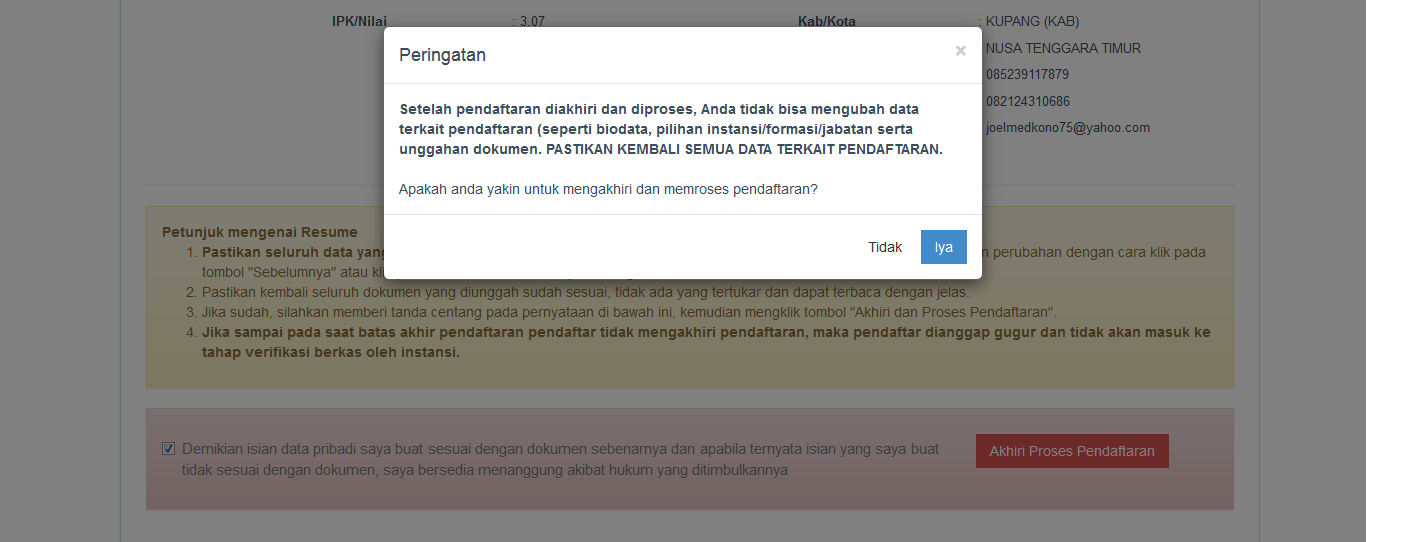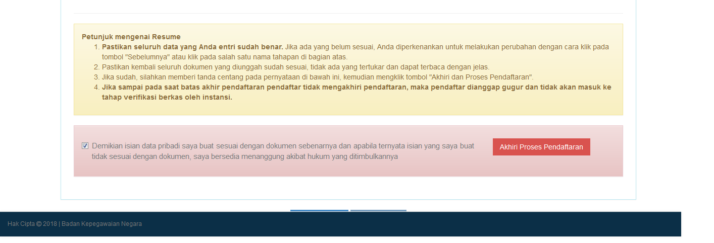 Setelah proses pengungahan berkas selesai kalian tinggal memilik selanjutnya dan langsuk akan diarahkan ke bagian Resume untuk melihat hasil pendaftaran yang sudah di lakukan di ditahap ini ada yang salah kalian silahkan klik sebelumnya dan edit sesuai keinginan kalian.