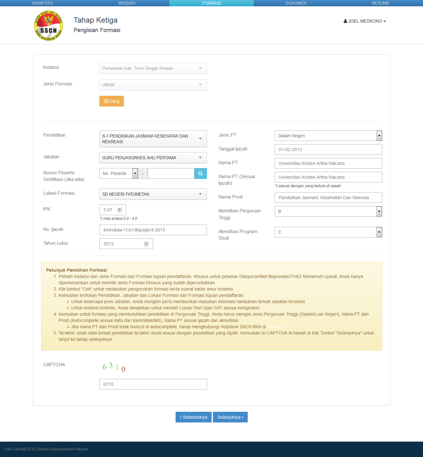 Setelah itu teman-teman akan diminta untuk menentukan indtansi dan jenis formasi setelah itu jang lupa unutk memilih Ulang dibawah jenis formasi yang teman-teman pilih, setelah itu isi sesuai dengan ijasah masing-masing peserta.