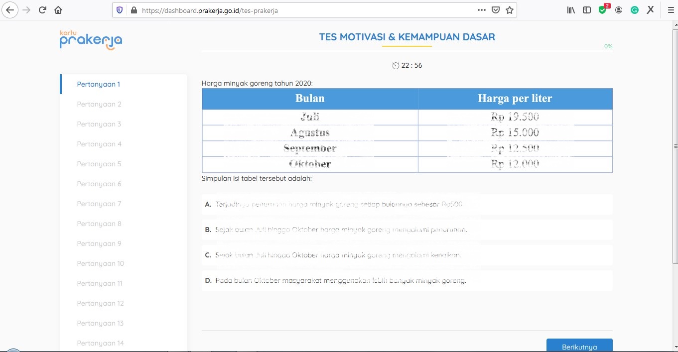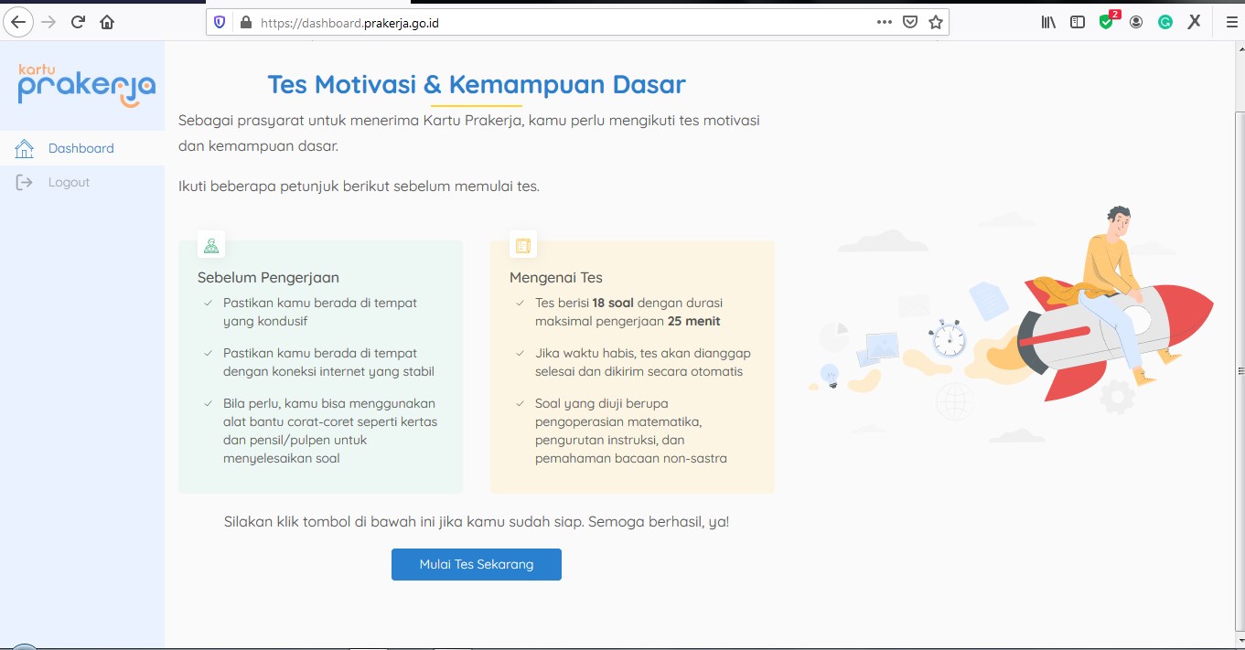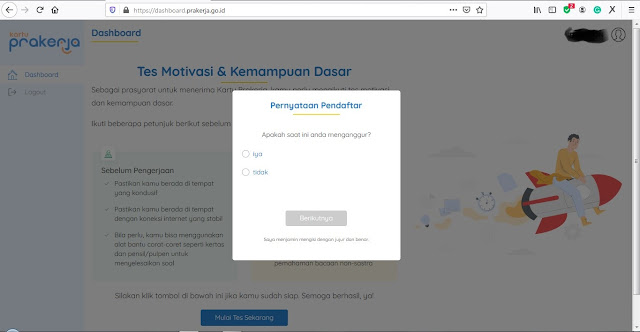 Setelah itu kalian akan diarahkan ke dasboard dan mulai memasuki Tes Motivasi dan Kemampuan Dasar silahkan menjawab Sesuai keinginan