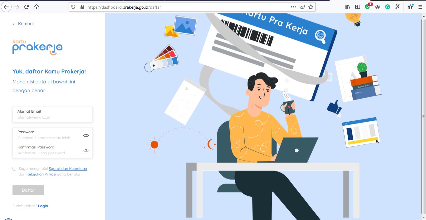 Silahkan Daftar mengunakan Email yang aktif isi password yang yang mudah diingat (bukan Password Email tapi Password untuk akun Kartu Prakerja)
