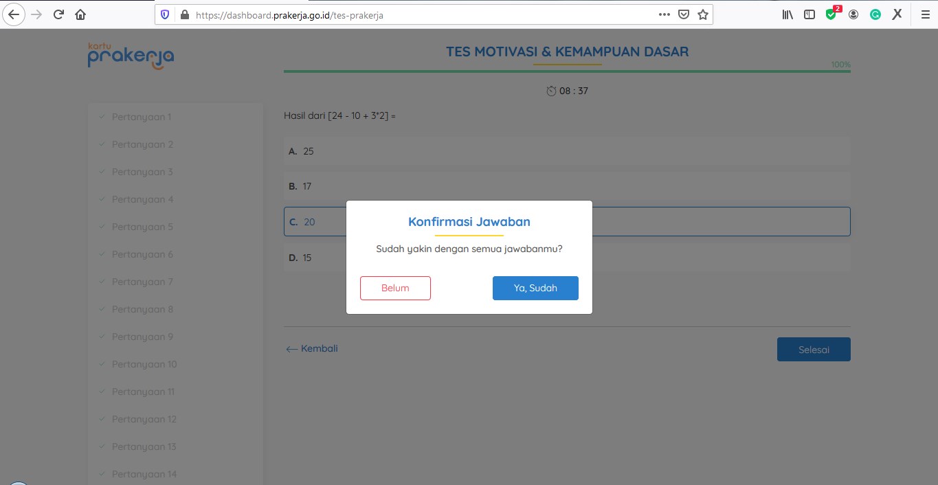 Setelah menjawab seluruh pertanyaan dan jikalau jawaban sudah diyakini benar maka silahkan pilih Ya,Sudah unutk mengkonfirmasi jawaban kalian