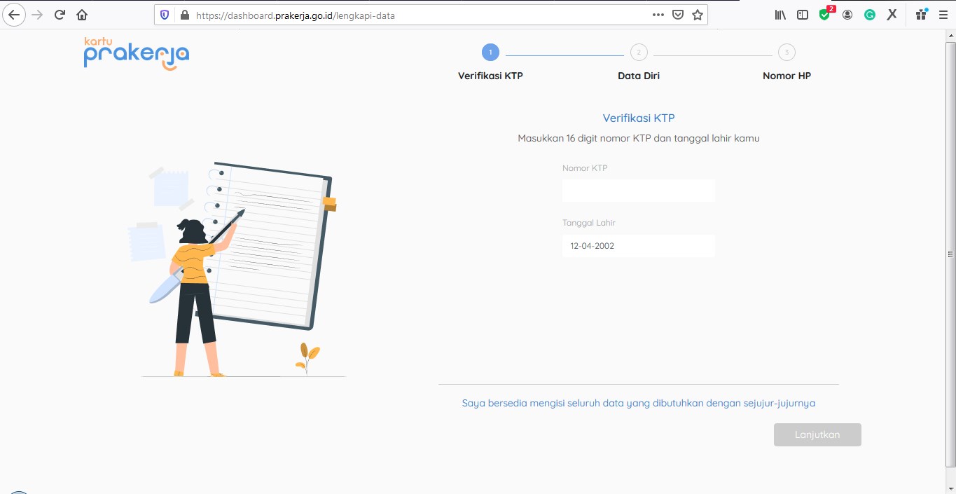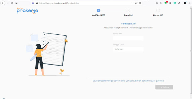 Setelah masuk pada tapilan awal kalian akan diminta unutk mengisi verifikasi diri berupa Nomer Induk KTP dan Tanggal Lahir masing-masing sesuai KTP setelah itu pilih Lanjutkan
