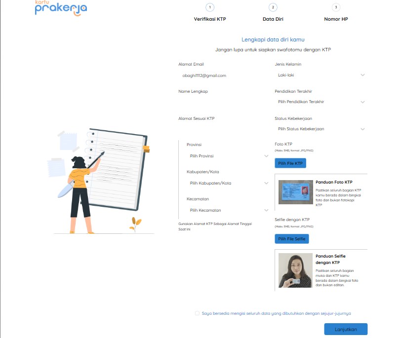 Setelah Verifikasi KTP Pada langkah berikut Isi Data diri sesuai data terlapir dibawah lalu pilih Lanjutkan. pada tahap ini dibutuhkan kesabaran dan koneksi Jaringa yang bagus agar tidak tesendat nantinya
